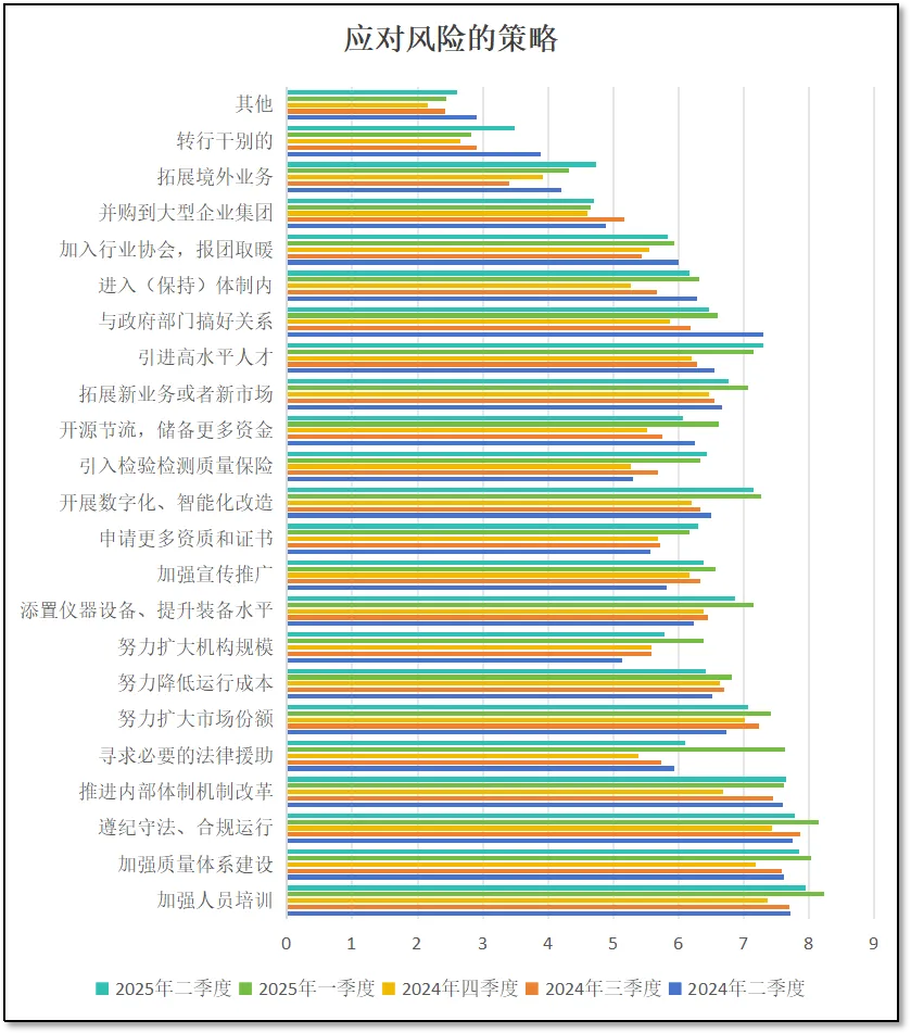 对于“市场经营”方面风险来说,分值从2024年二季度最初的3.87分提高到三季度的5.91分后,去年四季度末进一步提高到5.93分,但2025年一季度下降到4.11分,重归“低风险”区间,二季度进一步降低到3.98,分值已经低于体制机制、质量管理等其他几个风险事项,不再是从业者们认为风险最高的题,这从一个侧面也说明近期检验检测市场发展态势转好。