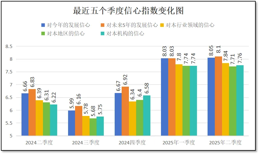 从“未来5年的信心指数”这一中期信心指标来看,在2024年二季度末该指标的得分分值为6.83分,三季度末下降到6.16分,在四季度回升到6.92分后,2025年一季度提高到8.03分,二季度末提升到8.1分,也是五季度以来的最高值。这说明进入2025年以后,尤其是我国一、二季度经济指标持续向好,外贸和消费数据不断增长,再加上印巴战争中中国武器装备的突出表现,国内国际社会对中国经济和综合国力增长的预期进一步升高,在这些因素叠加影响之下,检验检测从业者们对行业的中期发展信心也有了较大增长。