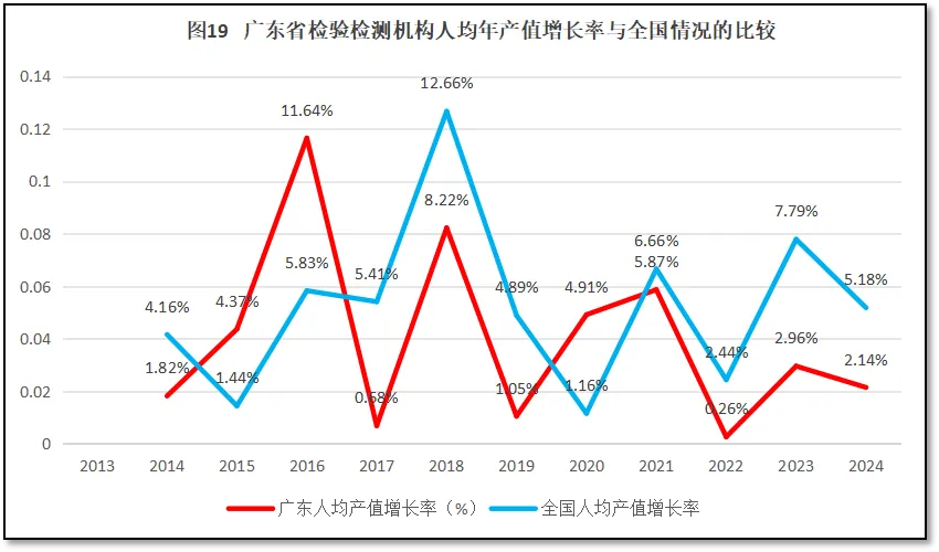 再来看广东省检验检测机构人均年产值增长率与全国人均年产值增长率的比较,如图19所示。