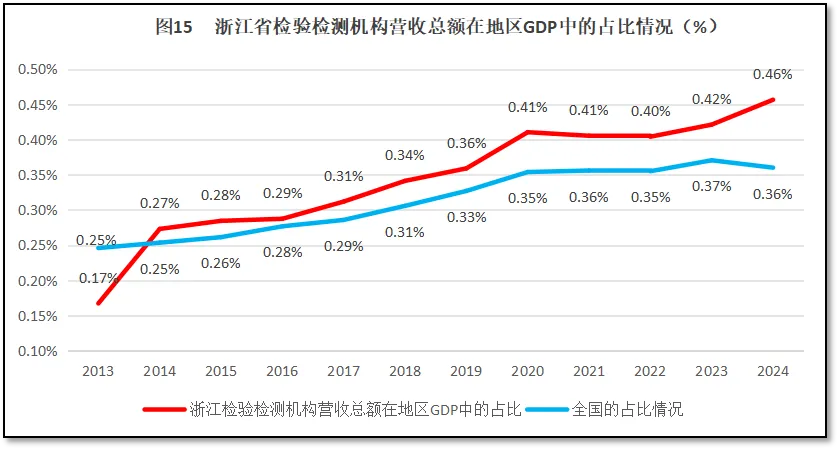 再来看浙江省检验检测机构营收总额在浙江省地区生产总值GDP中的占比情况。2024年度,浙江省检验检测机构营收总额411.41亿元,占当年浙江省GDP值的0.46%,较全国平均值0.36%高出很多,排名全国第6(按照由高到低排序),排名较2023年度提升1位,处于全国前列。过去12年,浙江省检验检测机构营收总额在当地GDP值的比例变化情况如图15所示。