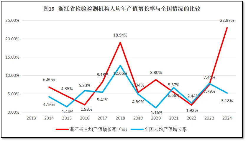 浙江省检验检测机构人均年产值增长率与全国人均年产值增长率的比较,如图19所示。