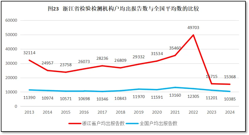 由图23可见,浙江省检验检测机构户均出具检验检测报告数量一直远高于全国平均数,在2021年之前几乎是全国平均数的2-3倍,2022年度甚至达到了全国平均数的4倍。不过,2023年度浙江省检验检测报告数量出现断崖式下降,从4.9万多份下降到1.5万份,净减少3.4万份,2024年数量进一步减少,为15368份。除了统计数据误差之外,检验检测报告数量的下降还可能跟浙江地区检测机构数量下降、企业委托方式改变等因素有关。