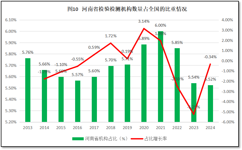 由图10可见,河南省检验检测机构数量在全国检验检测机构总数中的占比从2013年的5.76%开始逐年下降,到2016年达到谷底后逐步上升,到2021年达到6%的峰值后又开始下降,2024年占比下降到5.52%,是12年来的最低值。从增长率的变化情况来看,呈现一个M型的走势,在2018年和2020年有两个微小的增长峰值,此后大幅下降,在2023年出现了-5.25%的巨大降幅。2024年占比增长率有一定回升,但仍处于负值区间。河南作为中原地区的核心省份,其检验检测行业发展的比较早,检验检测机构数量也很多,但近年来发展速度变慢,行业出现萎缩,在全国检验检测行业中地位有下降的趋势。