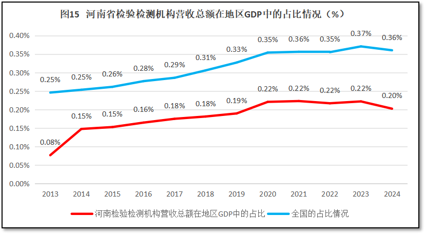 从图15可见,12年来,虽然河南省检验检测机构营收总额在当地GDP中的占比略有增长,但增长十分缓慢,最近4年一直停留在0.2%左右,2024年较2023年还有轻微下降,且其数值一直比全国平均数要低,与全国平均数存在较大差距。这说明河南省检验检测机构在河南省经济版图中的地位不高,其创造的价值与河南省的经济总量相比还很微小,这十二年来这种情况并没有发生根本变化。