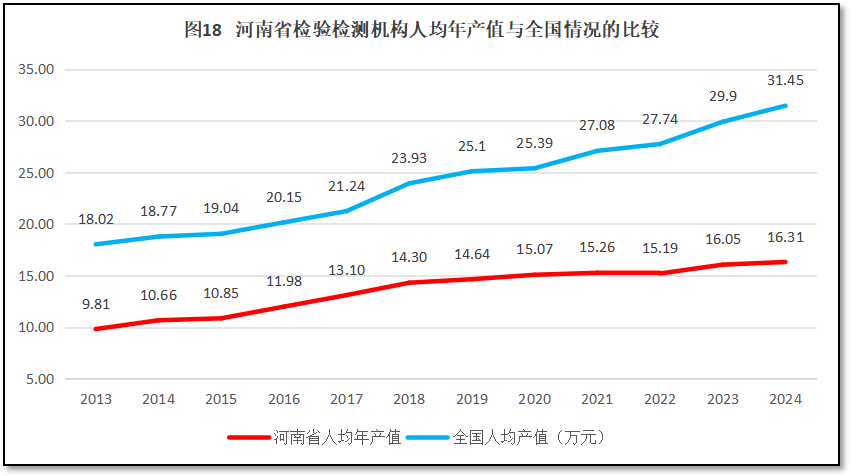 由图17可见,过去12年,河南省检验检测机构人均年产值总体保持增长,2024年达到16.31万元,是2013年的1.66倍。从增长率来看,在2016-2018年,河南省检验检测机构人均年产值增长较快,但从2018年以后逐年下降,2022年甚至出现人均年产值的“净下降”。2023年,河南省检验检测机构人均年产值增幅有所反弹,但2024年增长率有一次下跌,没有出现预期中的持续提升,说明推动行业提升发展质量的动力不足。