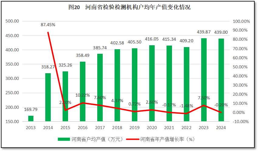 由图20可见,在2020年之前,河南省检验检测机构户均营业收入总体保持增长,但2020年大2022年连续三年出现下降。2023年有所回升,2024年又有下降。2024年户均年产值为439.9万元,是2013年的2.58倍。从增长率的曲线来看,除了头两年数据误差大显得增长率很高之外,从2015年起,河南省检验检测机构户均年产值增长率总体稳定,年均增速为3.33%左右,增幅不大。