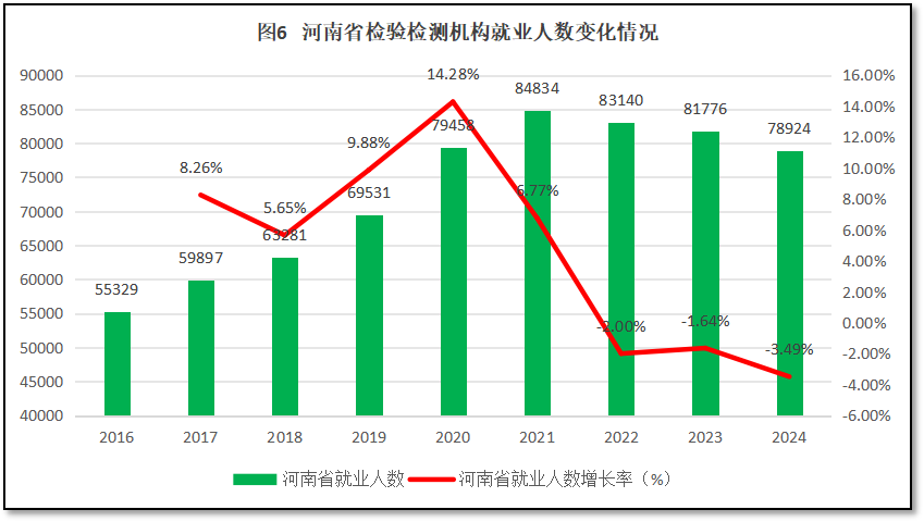 过去9年河南省检验检测行业就业人口的变化情况,如图6所示。由图6可见,从2016年到2021年,河南省检验检测行业就业人数持续增加,2021年达到8.48万人的高点。此后,河南省检验检测就业人数逐步下降,到2024年末,就业人口数量下降到7.89万人,比2021年的最高峰已经净减少近6000人。从增长率来看,2020年之前增长率持续增高,并在2020年达到14.28%的增长高峰。此后增长率逐年下降,2024年度的同比增幅为-3.49%,为历年最低。