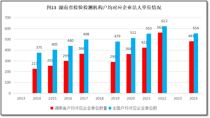 再来看检验检测机构户均对应的企业法人单位数量情况。过去12年湖南地区检验检测机构户均对应企业法人单位数量与全国情况的比较,如图13所示。