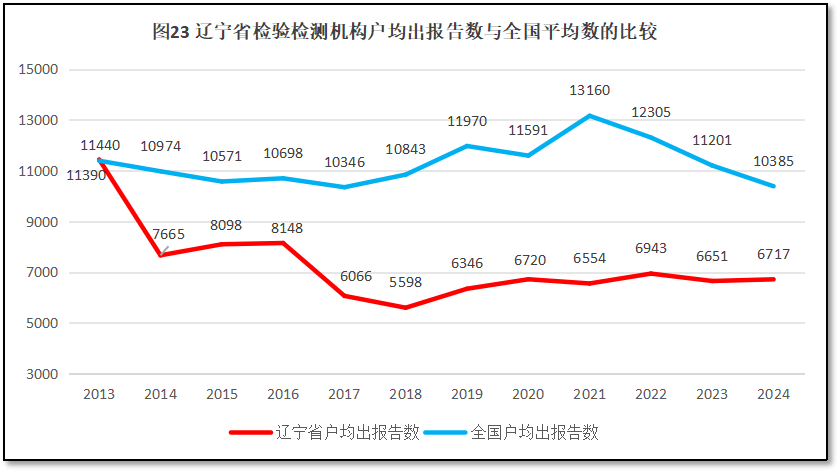 2024年度,辽宁省检验检测机构户均出具检验检测报告6717份,是全国平均水平10385份的64.6%,全国排名第19位,较2023年度排名提升4位。从2013年以来,辽宁省检验检测机构户均出具检验检测报告数量与全国的比较如图23所示。